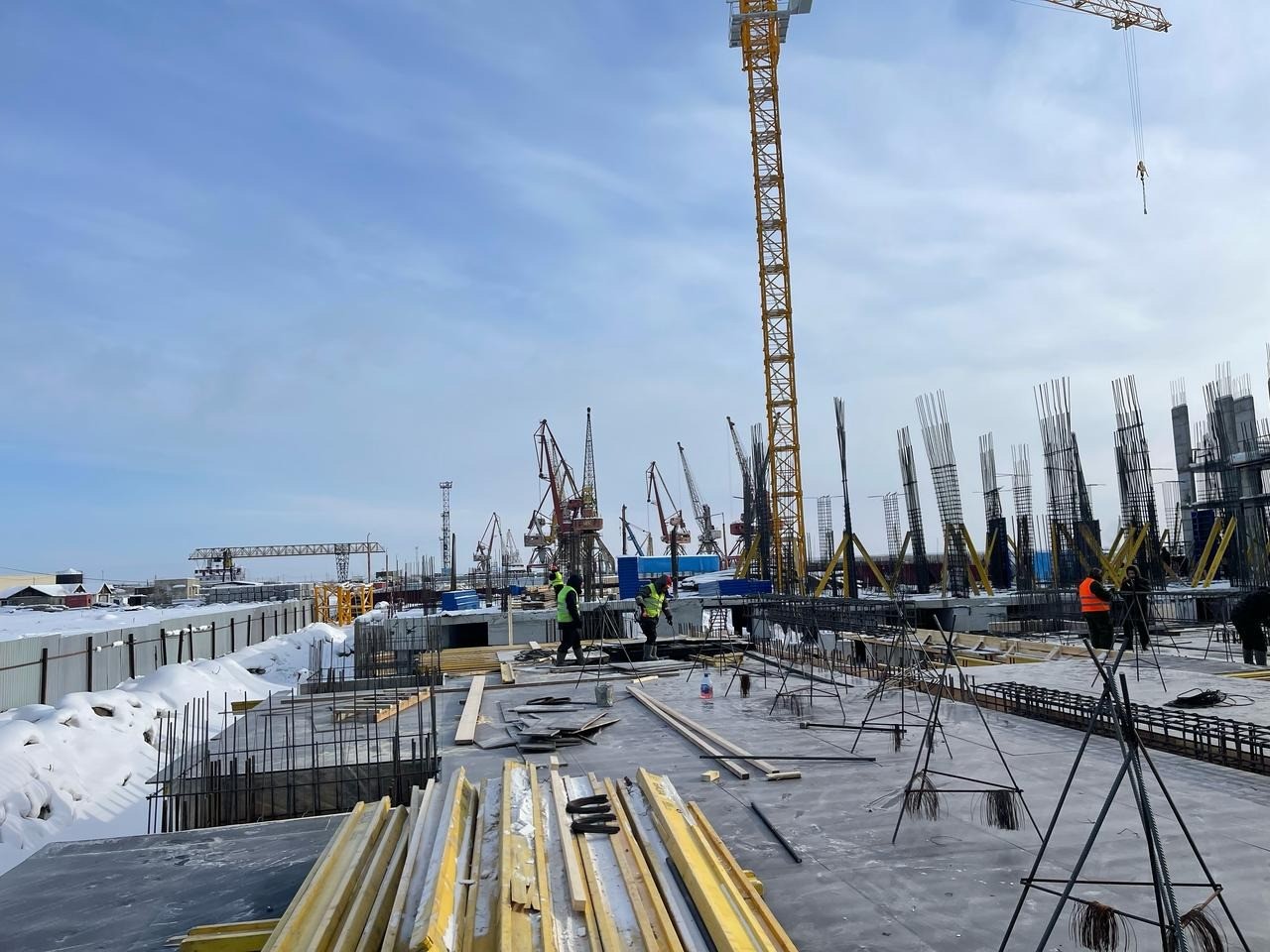 - Продолжаются работы по армированию и устройству опалубки цокольной плиты стилобатной части (также с электропрогревом).