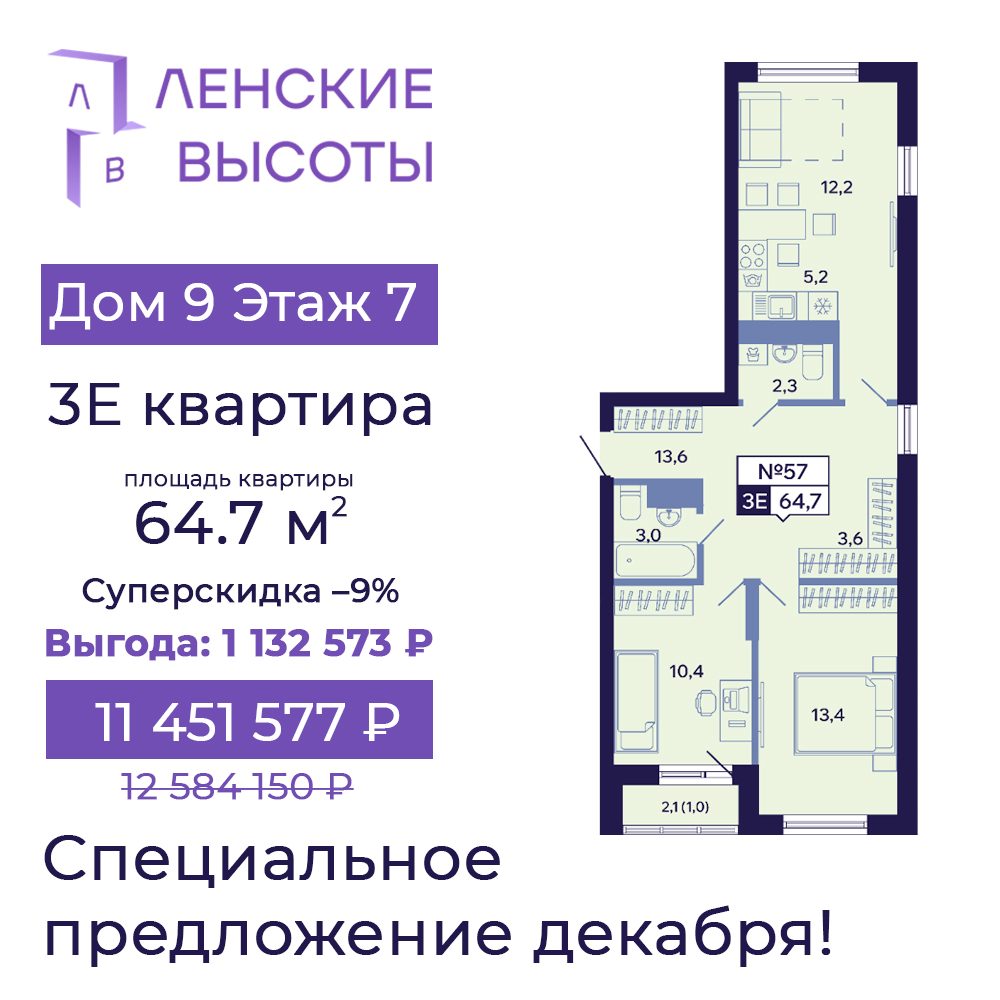 - 3Е, 64.7 м² — выгода 1 132 573 ₽