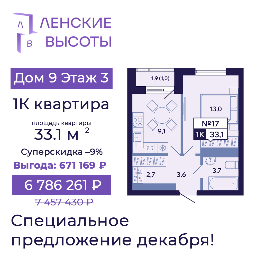 - 1К, 33.1 м² — выгода 671 169 ₽