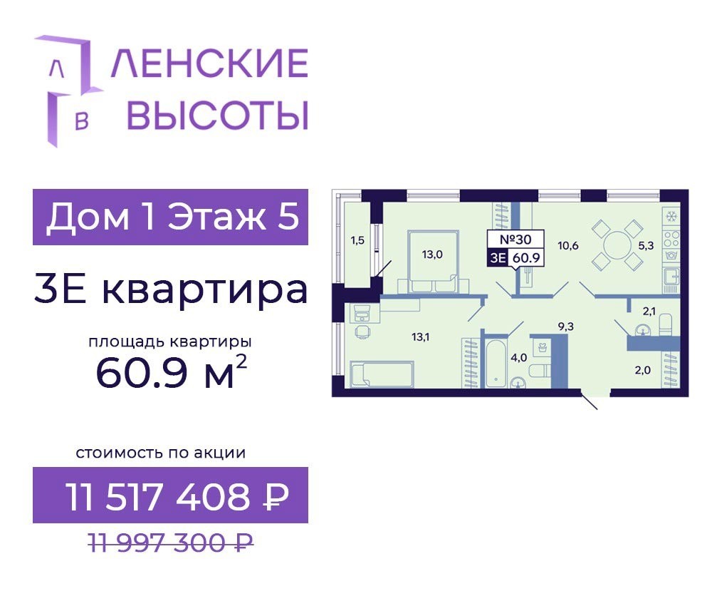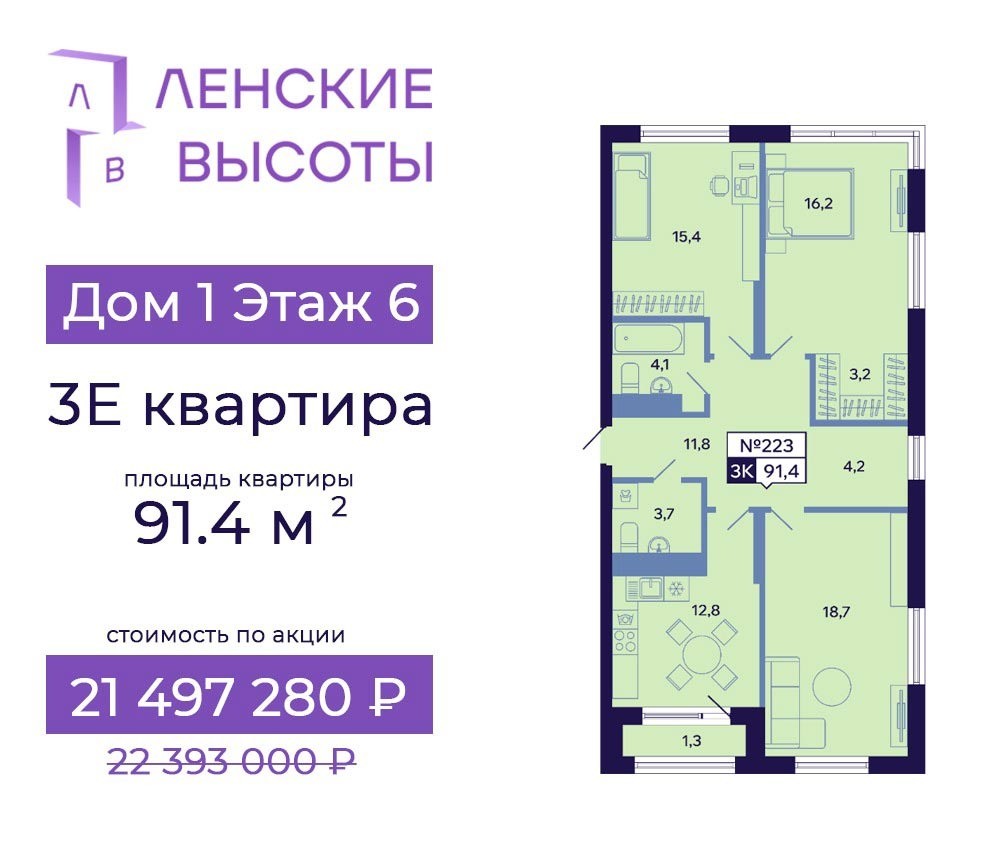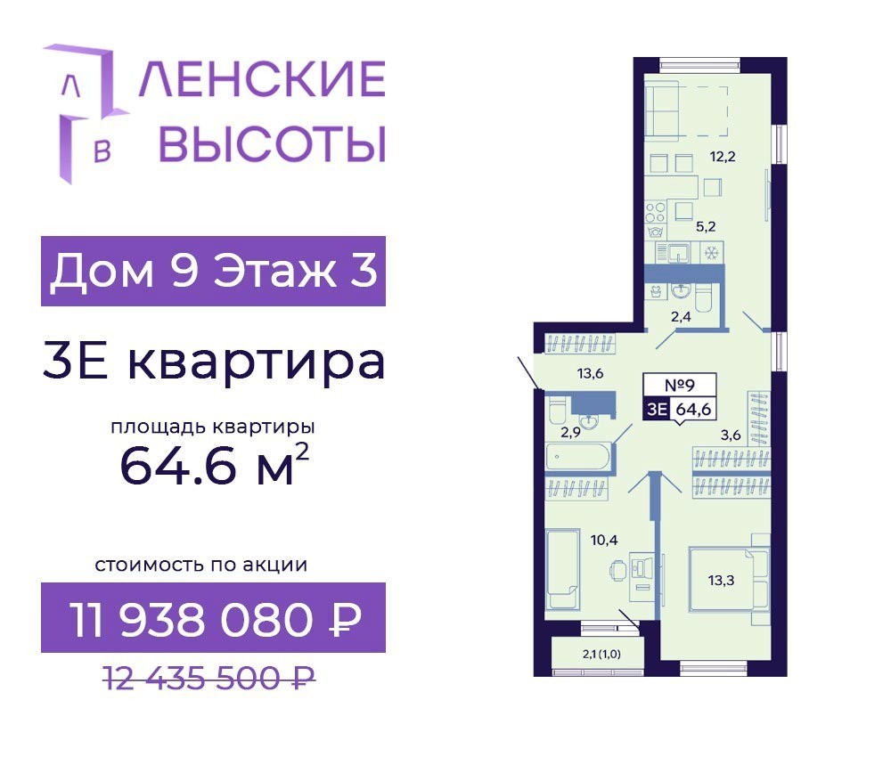 Предлагаем рассмотреть подборку 3-комнатных квартир в ЖК «Ленские высоты». Благодаря большой площади комфортно будет всем "домашним".