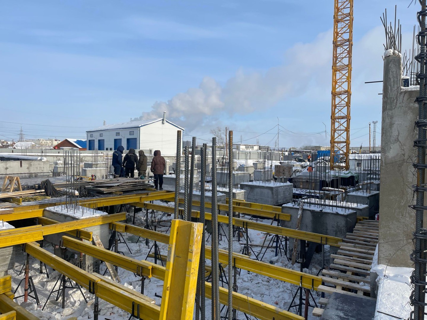 - Продолжаются работы по армированию и устройству опалубки цокольной плиты стилобатной части (также с электропрогревом).