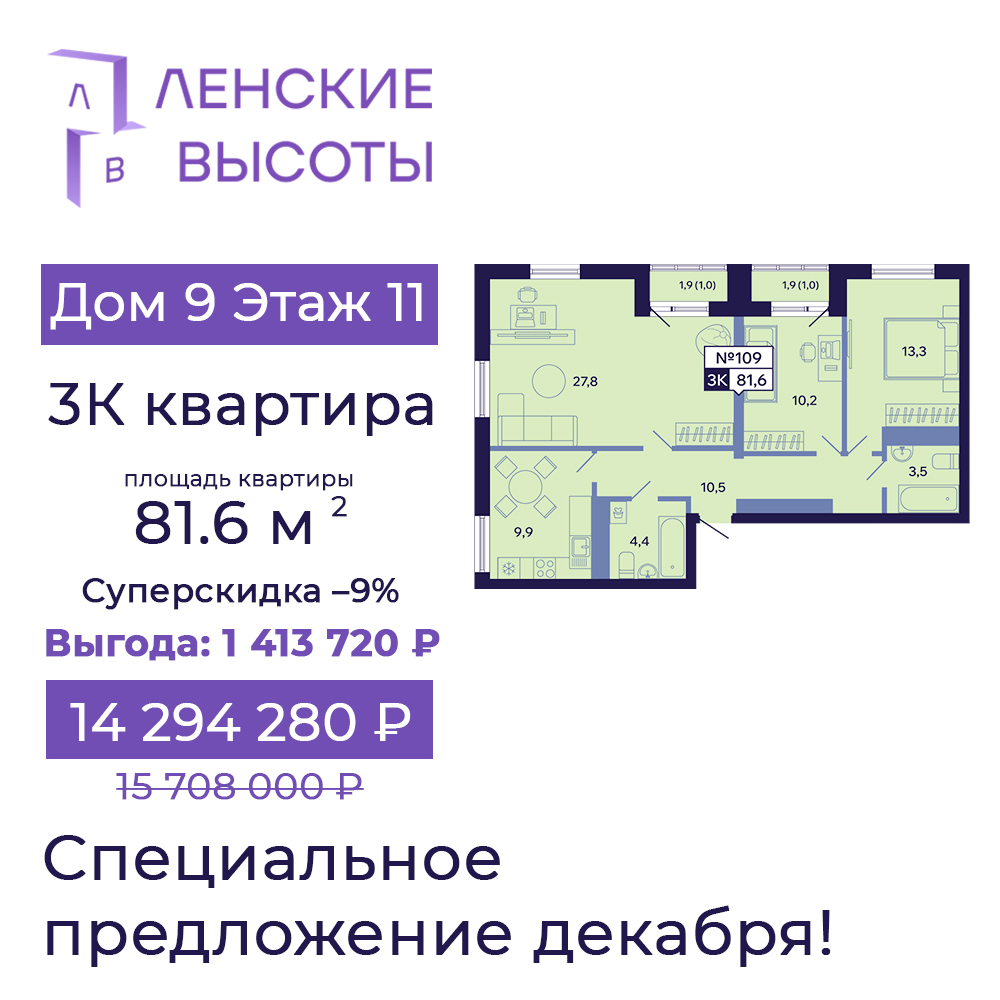 - 3К, 81.6 м² — выгода 1 413 720 ₽