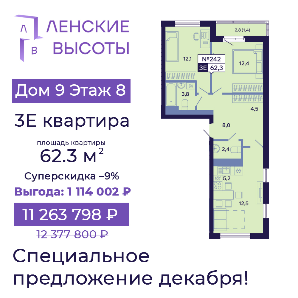 - 3Е, 62.3 м² — выгода 1 114 002 ₽