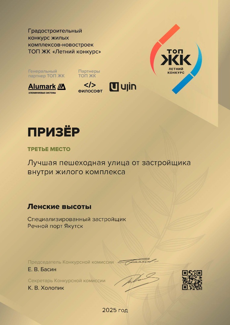 Жилой квартал «Ленские высоты» в Якутске вошёл в число победителей престижного всероссийского конкурса ТОП ЖК–2025, заняв третье место в номинации "Лучшая пешеходная улица от застройщика внутри жилого комплекса".